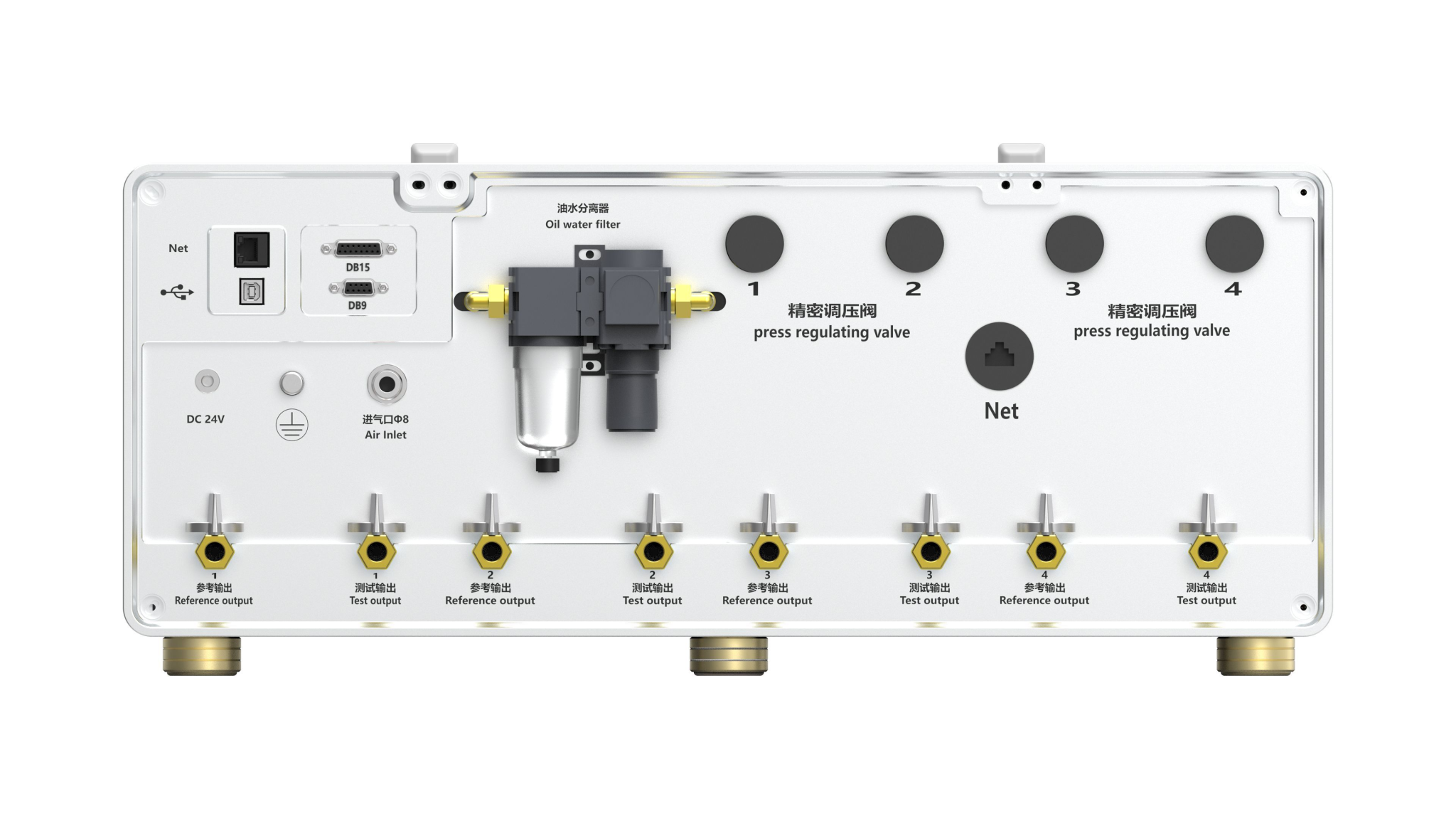 仪器背面设置有四个可调节的精密压力调节阀,方便单独调压。油水分离器可过滤空气中的杂质,保证气体的干净。4 工位测试接口及标准件接口均装有开关阀门。此外,仪器还可储存 10 万条测试结果,包括测试时间、测试参数、泄漏量等数据,方便客户追溯产品信息,也支持连接扫码枪、上位机、MES 系统等,具备多种通信接口,10种压强单位和10种泄漏量单位可自由切换,仪器自带泄漏自检功能,有效避免因仪器本身泄漏导致的测试结果不准确。