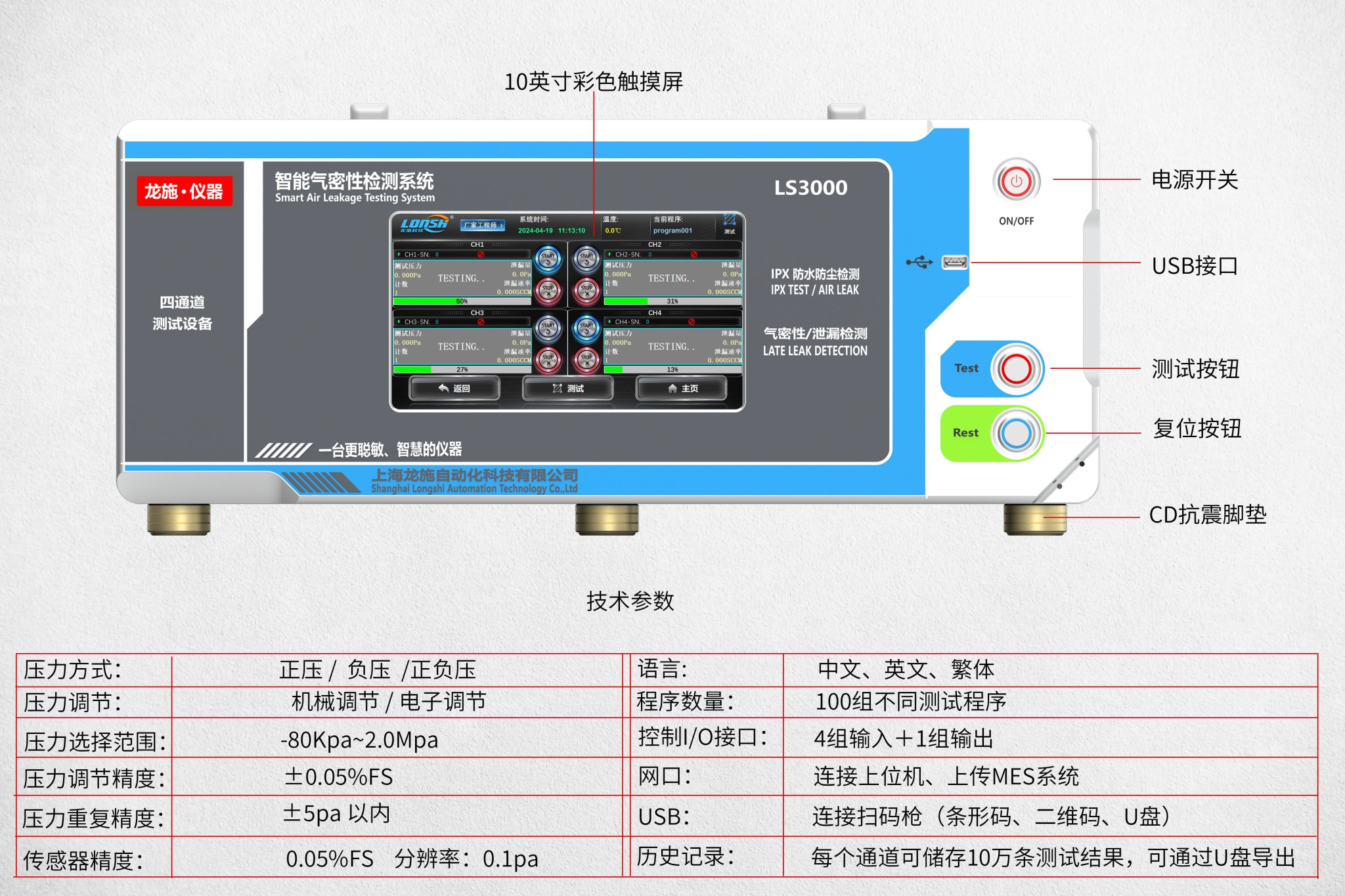 近期全新上市的第五代LS-3000系列,四通道气密性测漏仪/气密性检测仪,采用差压式检测原理,集正压、负压、容积等测试功能为一体,实现多种产品的防水测试,无论是整机,还是半成品,带有充气孔的产品还是全封闭没有充气孔的产品,都能够轻松拿捏。