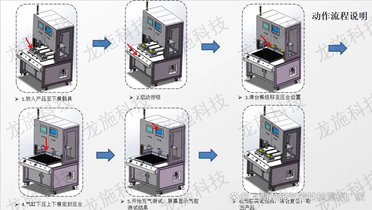 到位传感器感应到治具到位后,下压气缸下压带动上模组件压紧被测产品,形成一个密封腔体;