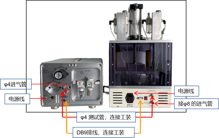 将仪器测试接口的气管连接到工装治具上,并连接好工装的电源线和气源。