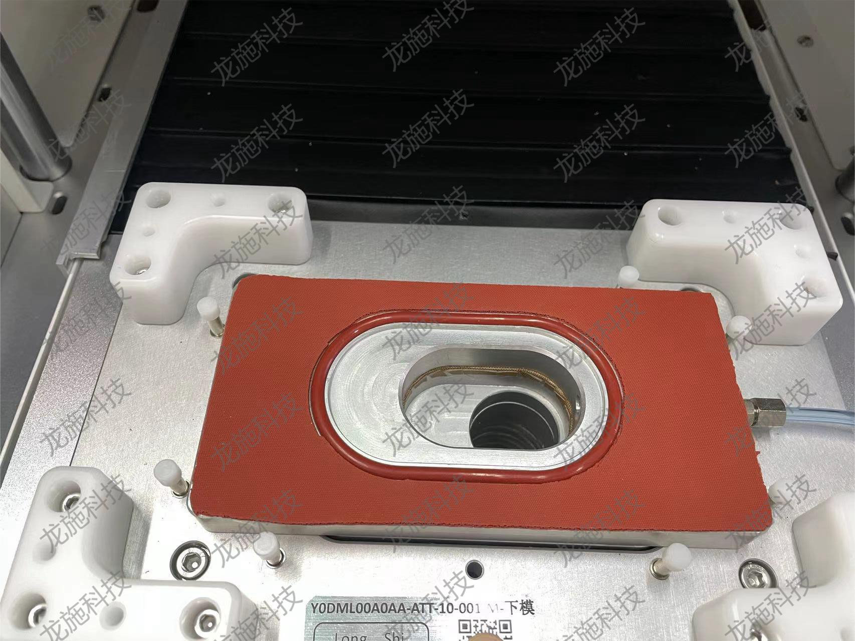 本次设计定制的工装设备,它采用滑轨式设计,并结合上下密封模具,能够对产品进行有效的密封固定。