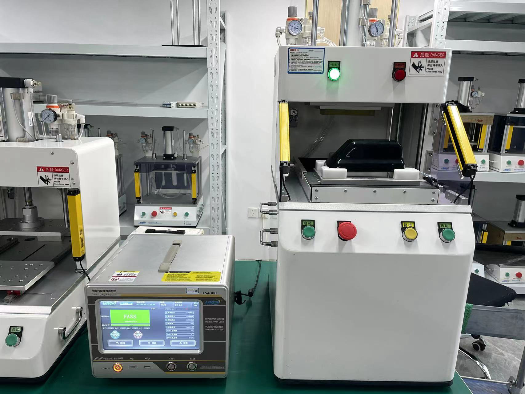 在使用工装进行测试之前,需要点击保存程序进入测试界面。接下来,双手启动工装下模,让其自动滑进,然后上模下压对产品进行密封固定。此时,仪器将自动进入测试模式,向测试产品内部充入气压,并通过稳压、测试、排气等步骤来监测产品内部的压力变化。通过计算泄漏值,就可以判断产品是否合格。