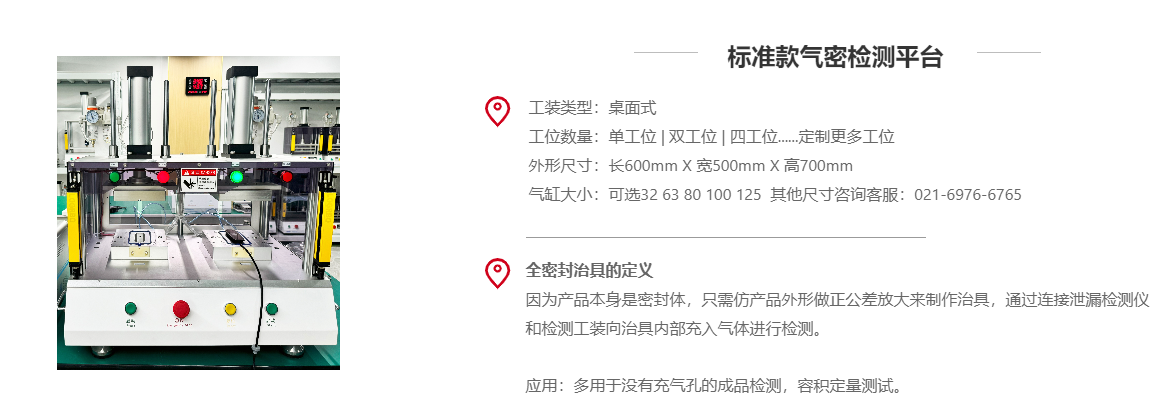 应用:依据产品特性以及客户要求制作,与气密性检测仪配合使用,适用于多种检测工况,按需定制。桌面式检测平台,占地面积小,适合体积较小的产品测试。