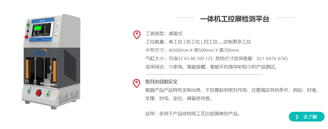 大多数产品在进行气密性检测时,需要制作密封治具,搭配检测平台一起使用,与气密性检测仪、泄漏检测仪和密封性检测设备配合,组成完整的检测系统。根据客户的需求和产品的密封部位特点,可以定制不同类型的检测工装平台。目前,龙施科技提供的检测工装平台主要分为桌面式和机柜式两种类型。