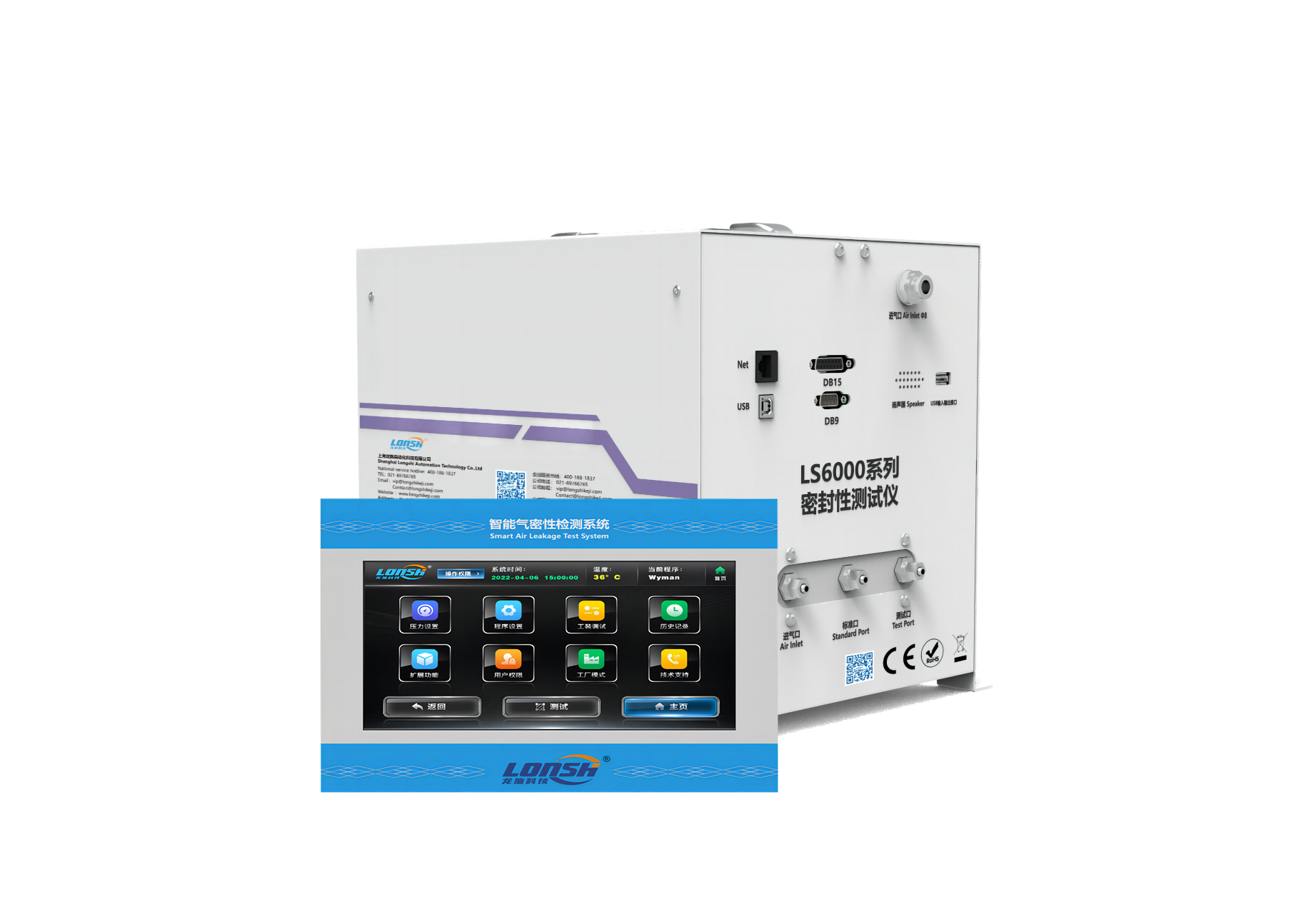 标配采用龙施全功能阀岛,正、负两种压力形式和8种测试方法;可以将两种压力形式及5种测试方法编写成20多种测试功能。