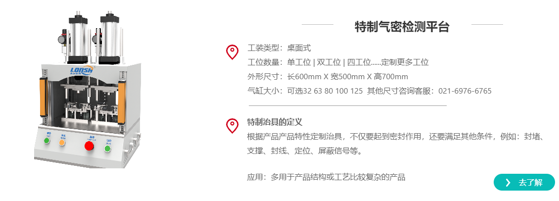 应用:依据产品特性以及客户要求制作,与气密性检测仪配合使用,适用于多种检测工况,按需定制。桌面式检测平台,占地面积小,适合体积较小的产品测试。