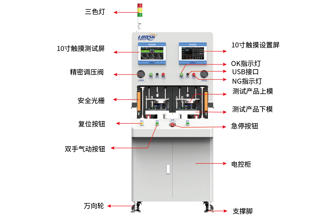 应用:全自动智能密封性测试系统,无需另备工作台,可接入打印机和键盘鼠标等外部设备,操作简单。底部装有万向轮和支撑脚,自由移动,放下支撑脚固定设备,移动方便快捷。